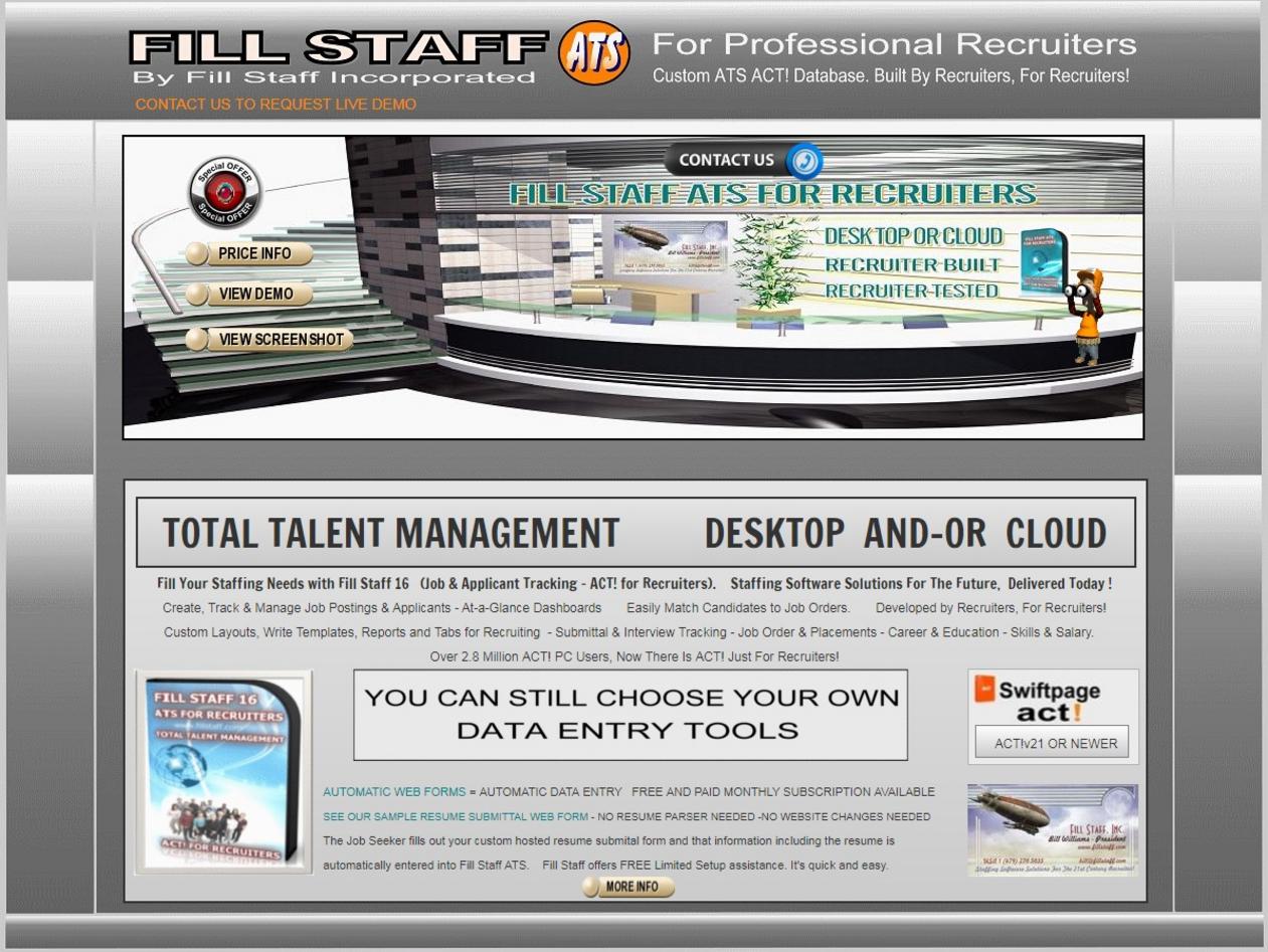 I highly recommend the Fill Staff ATS For Recruiters ACT! software add-on. I have been using this software package for about 3 months. In that short amount of time, I have become more organized and able to retrieve information more quickly. This translates into closing deals faster.